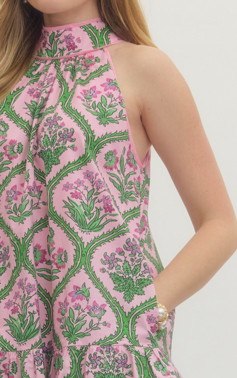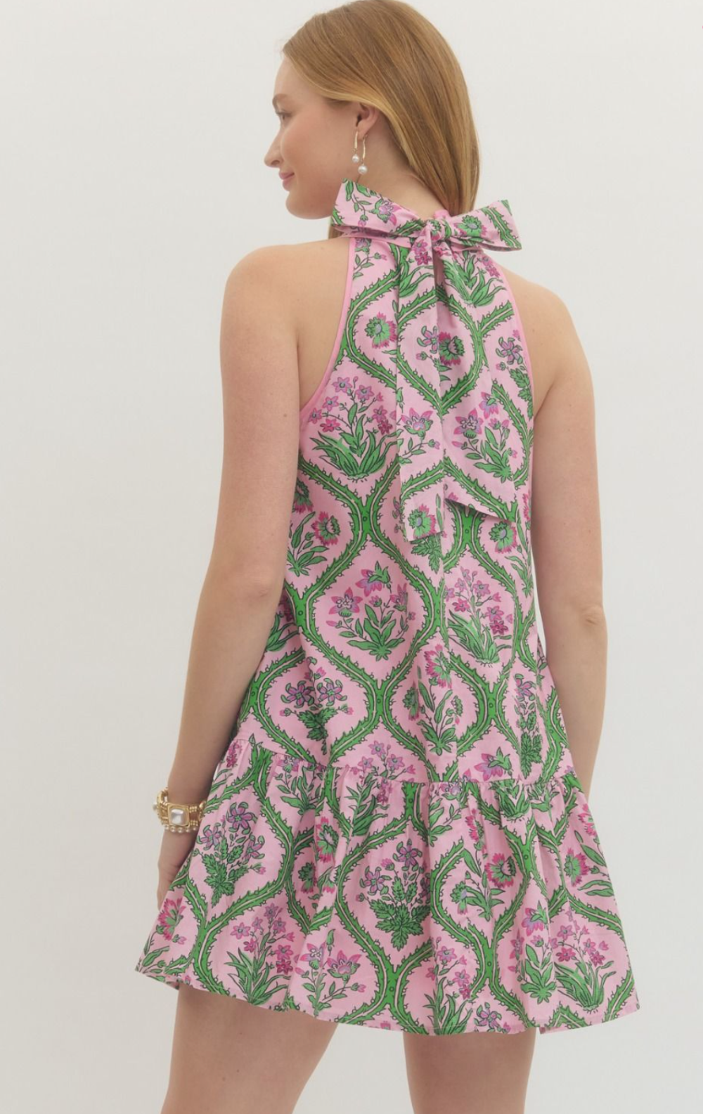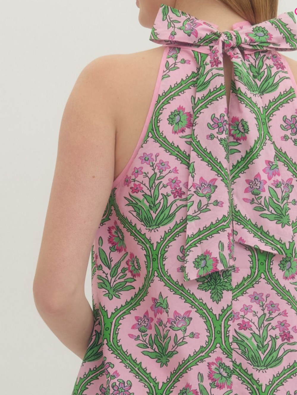 Effortless summer style meets practical design in this charming mini dress. The sleeveless silhouette and halter neckline with self-tie bow in back create a flattering, adjustable fit that works for various body types. A playful ruffle hem adds movement and visual interest, while functional side pockets keep your essentials close. Fully lined for comfort and confidence. Perfect for warm-weather outings, casual gatherings, or dressed-up occasions.